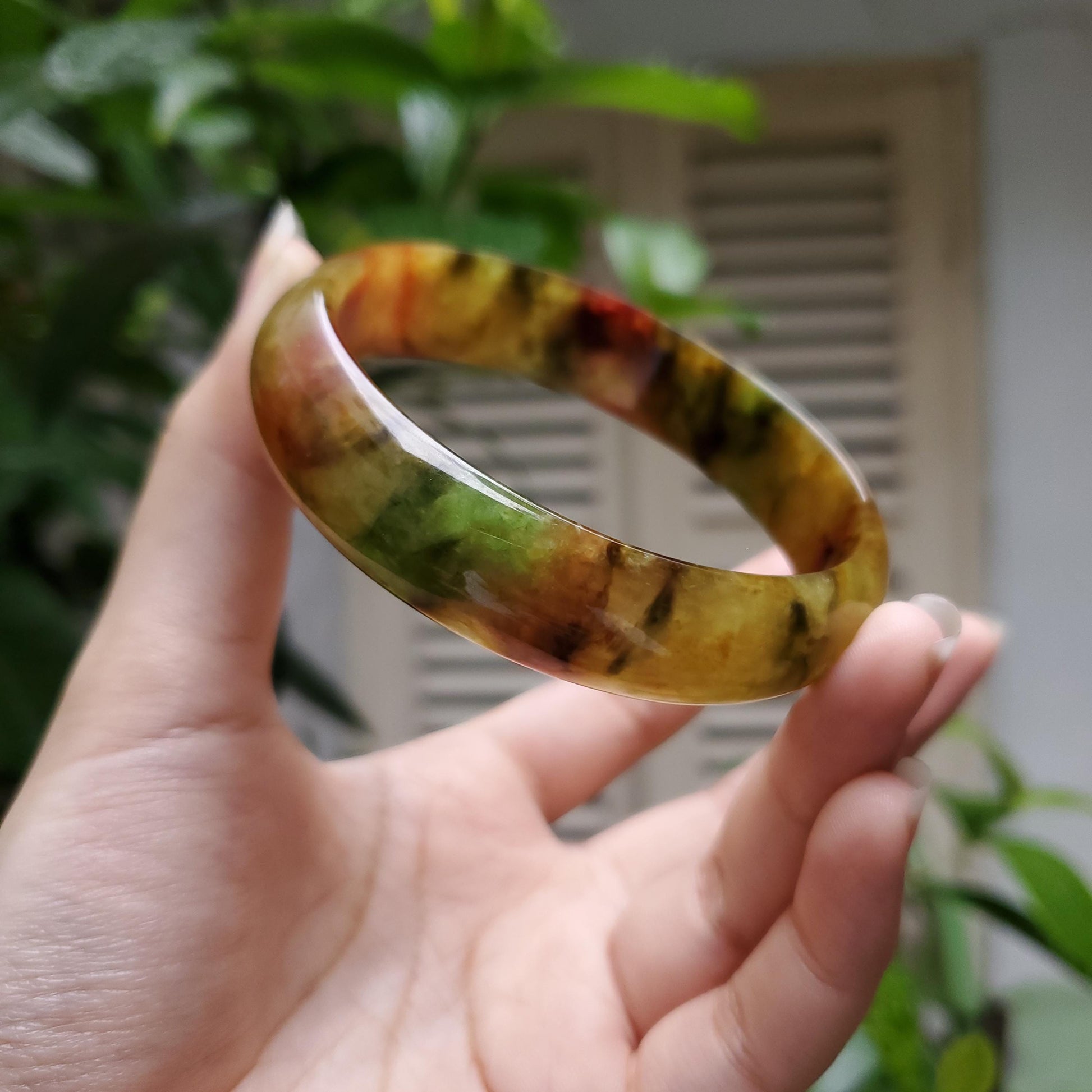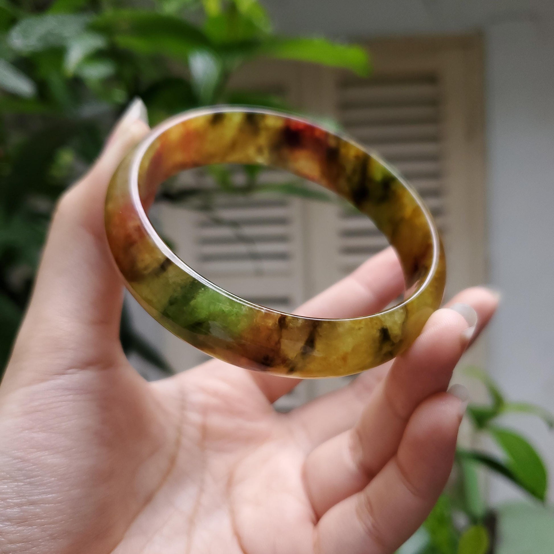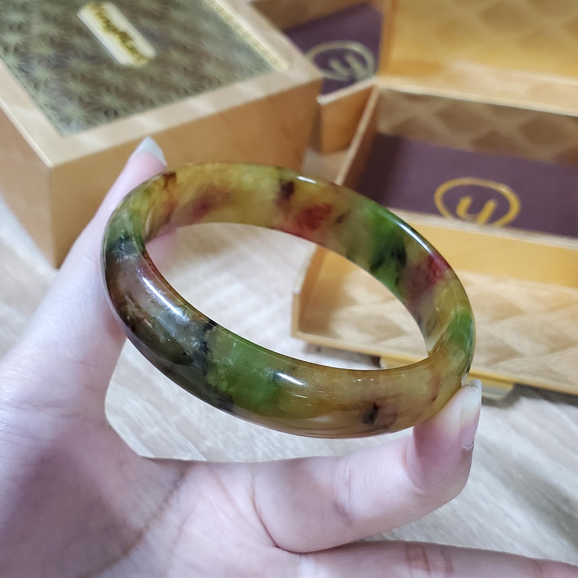 High Quality 48-72mm Jadeite Jade Bangle, Yellow Mixed Green Black Brown Spot, Burmese, D-Shape, Feng Shui Jewelry, Gift for Mom