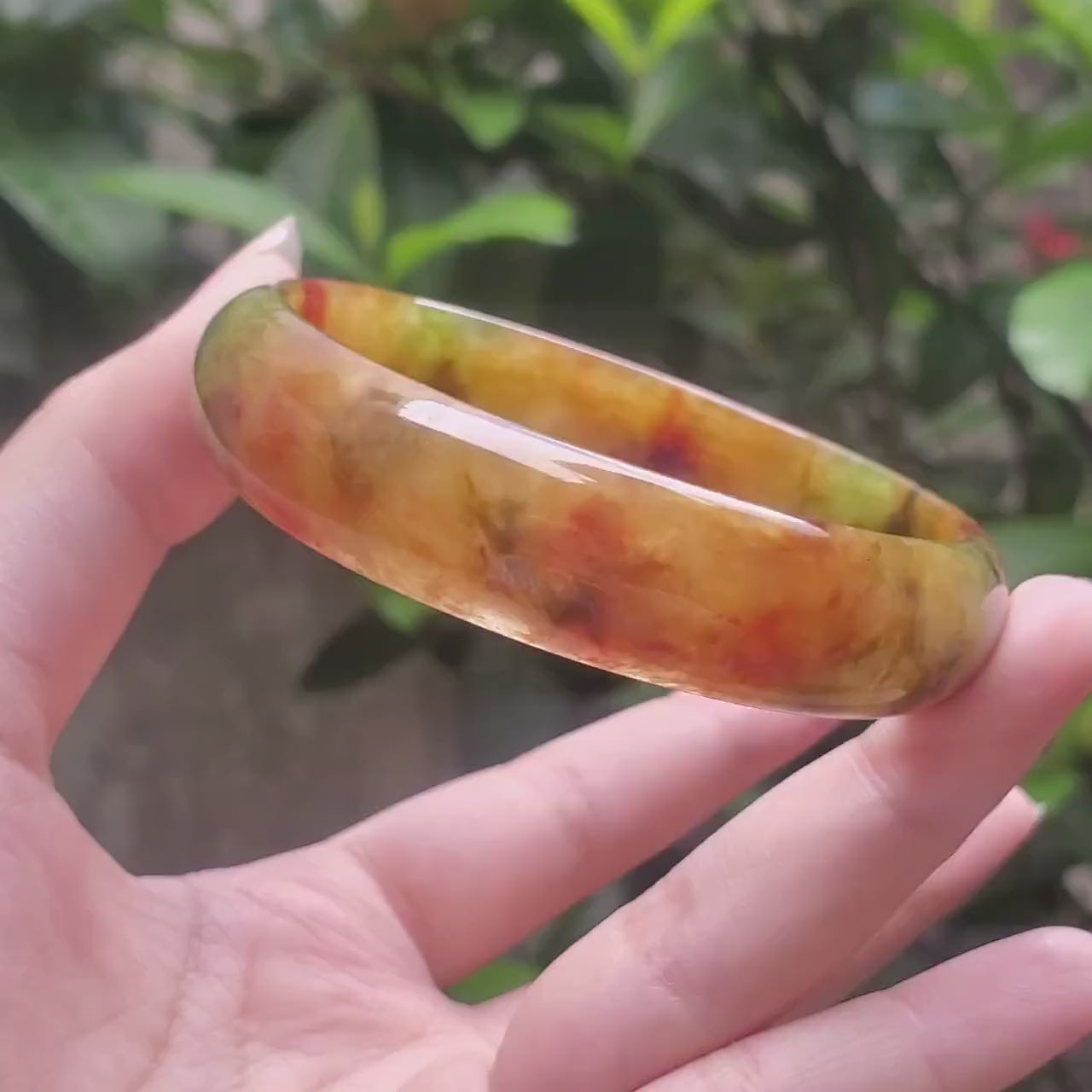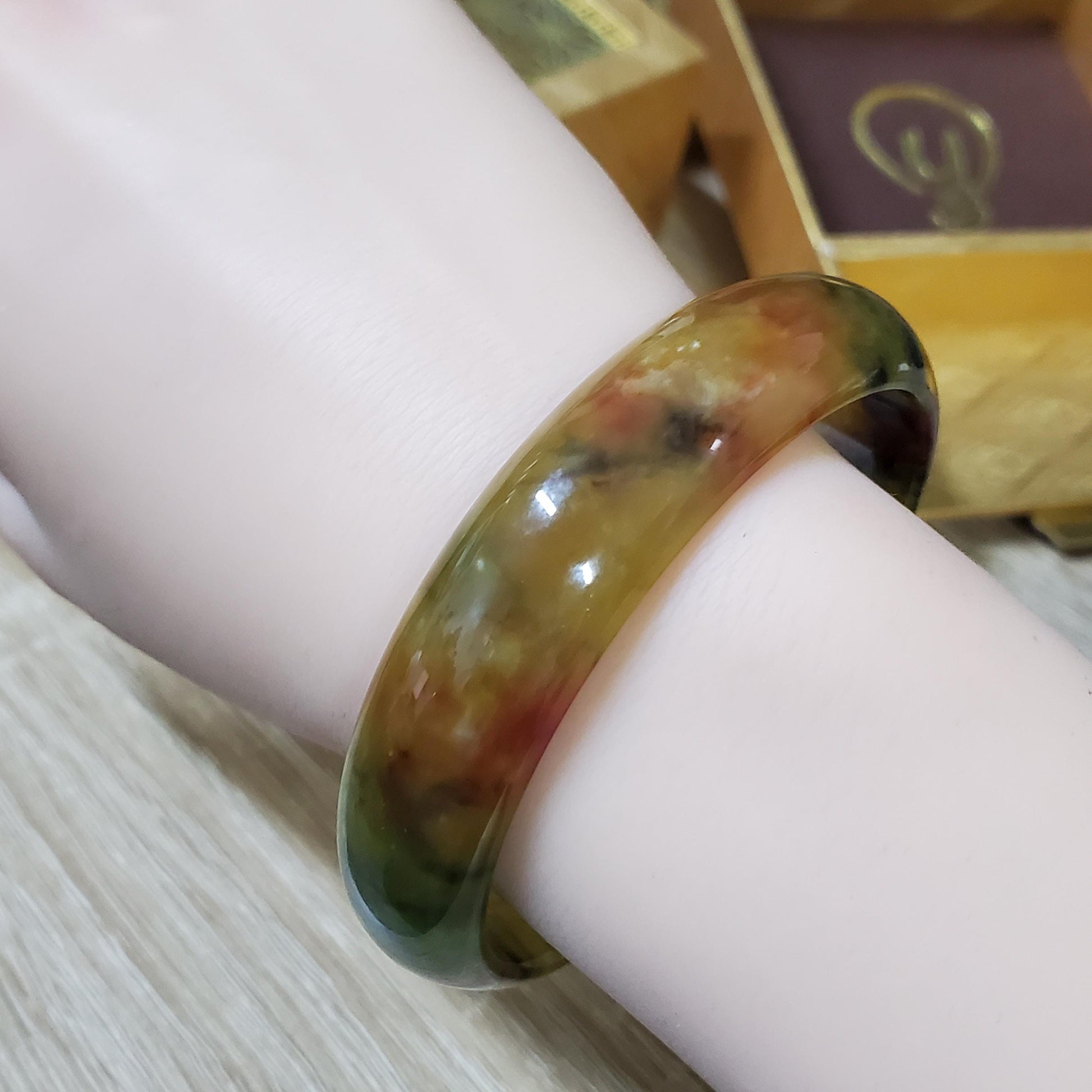 🎁 Timeless Vintage Elegance: High Quality Yellow mixed Green/Black/Brown Spot jade bangle symbolising wealth, health & prosperity.
