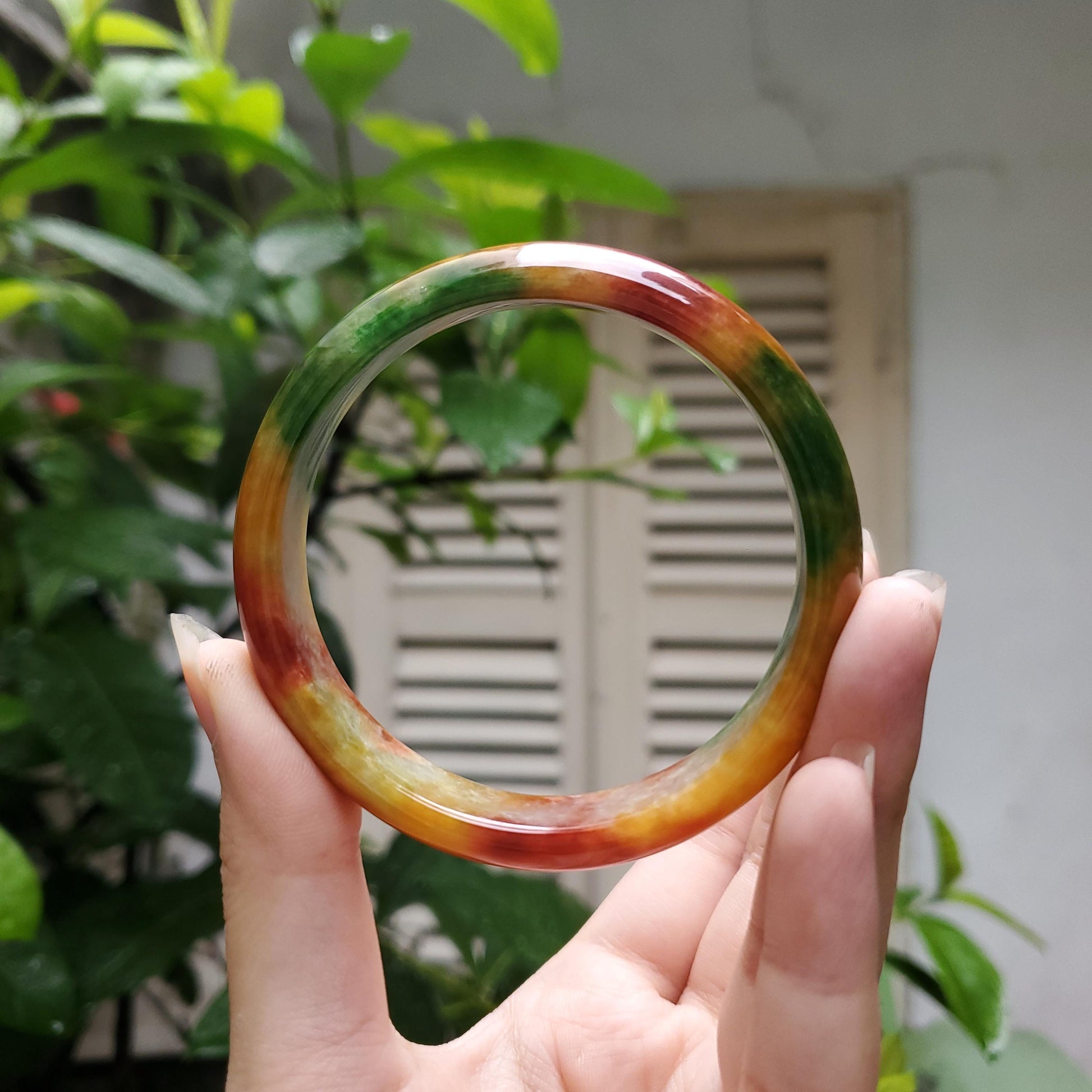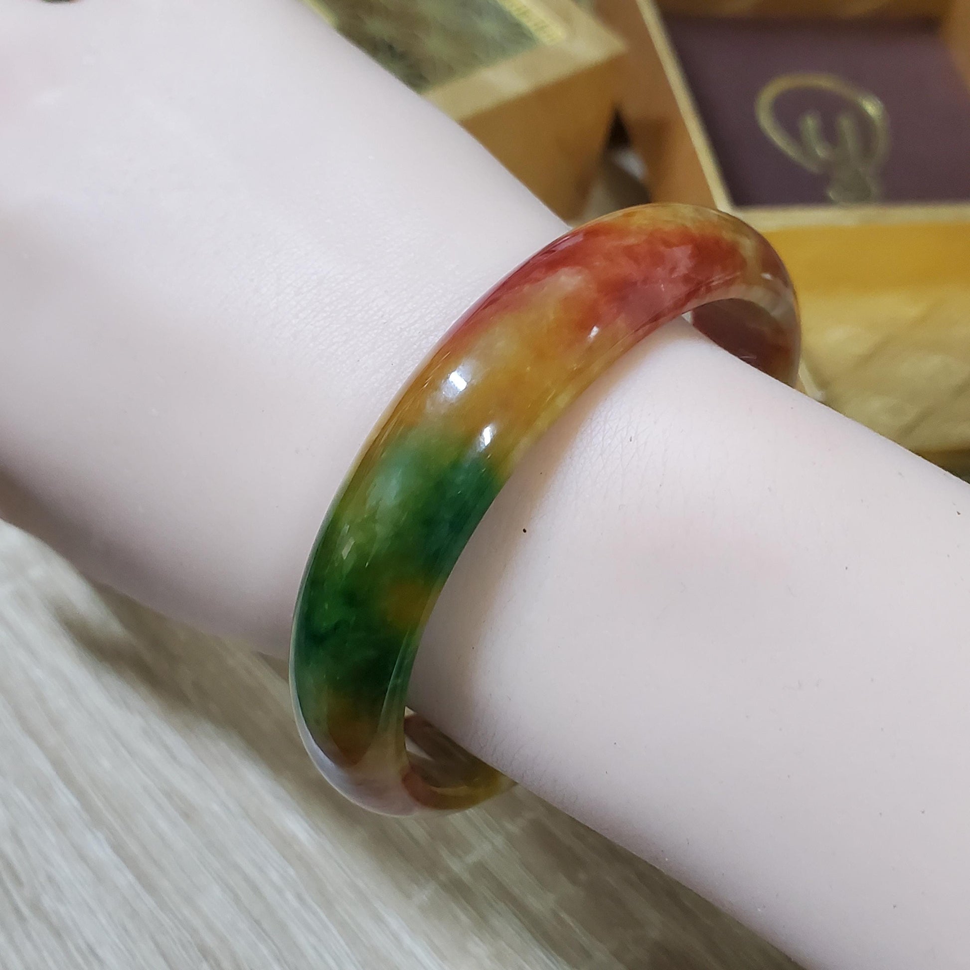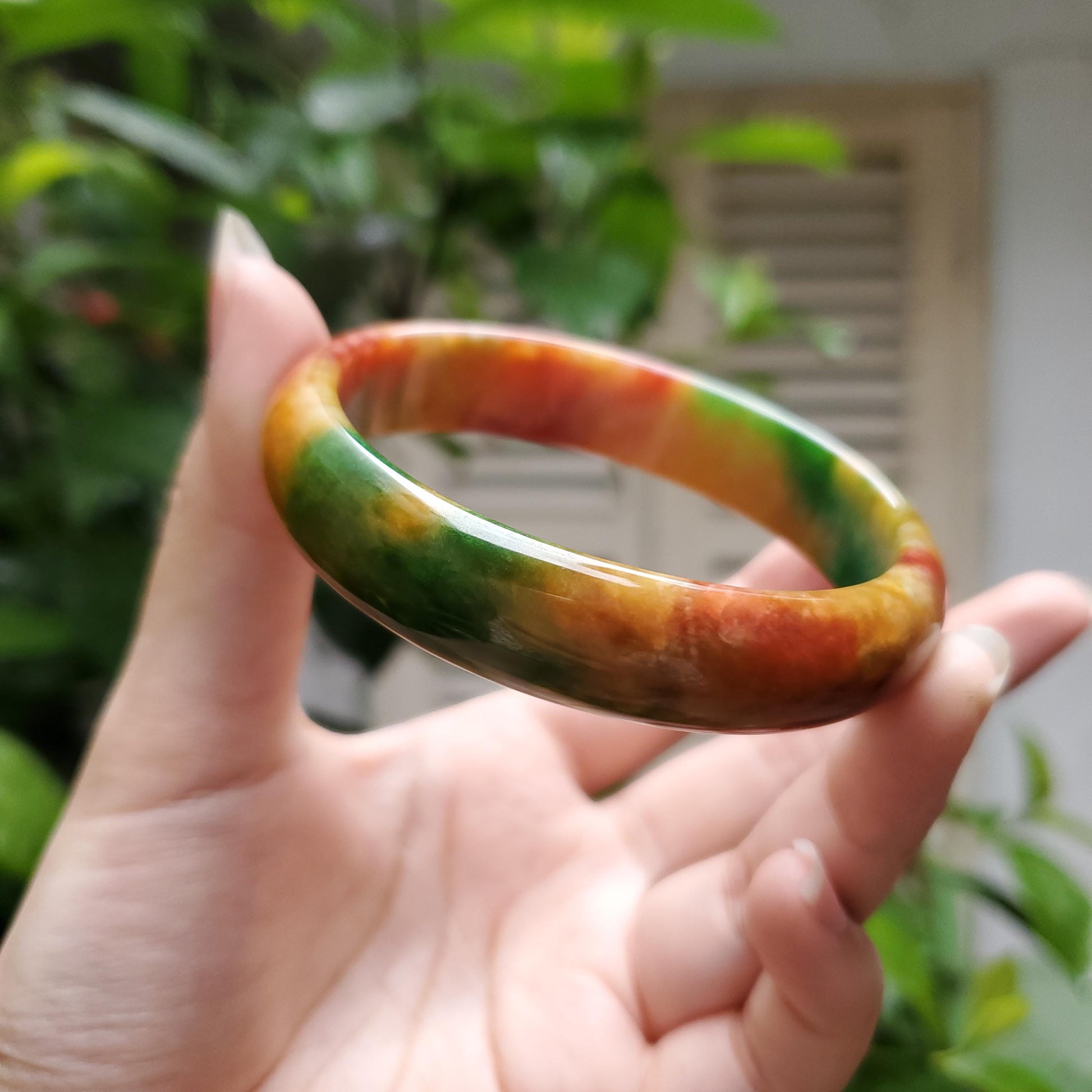 π Timeless Vintage Elegance: High Quality Orange Yellow with Green Spot jade bangle symbolising wealth, health & prosperity.