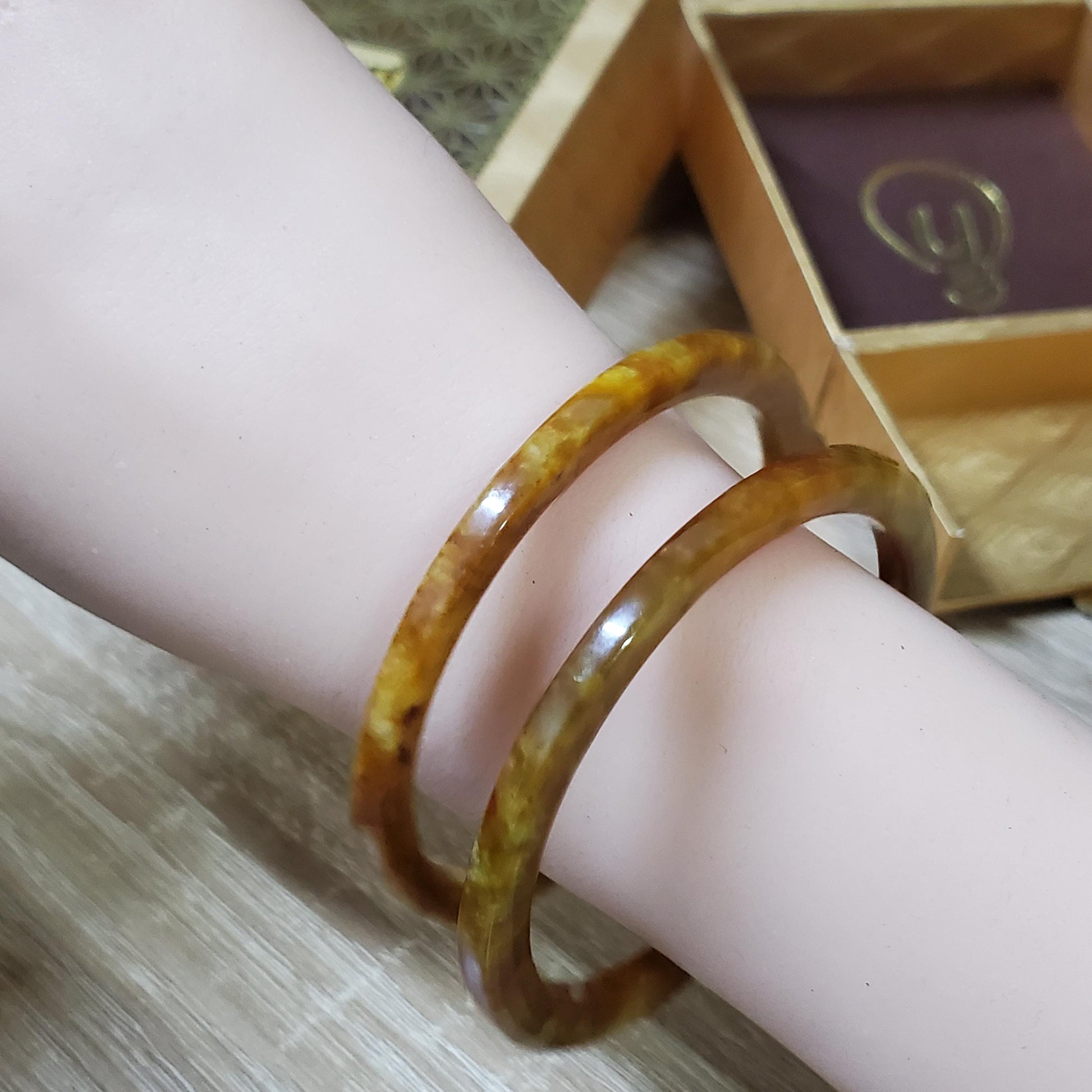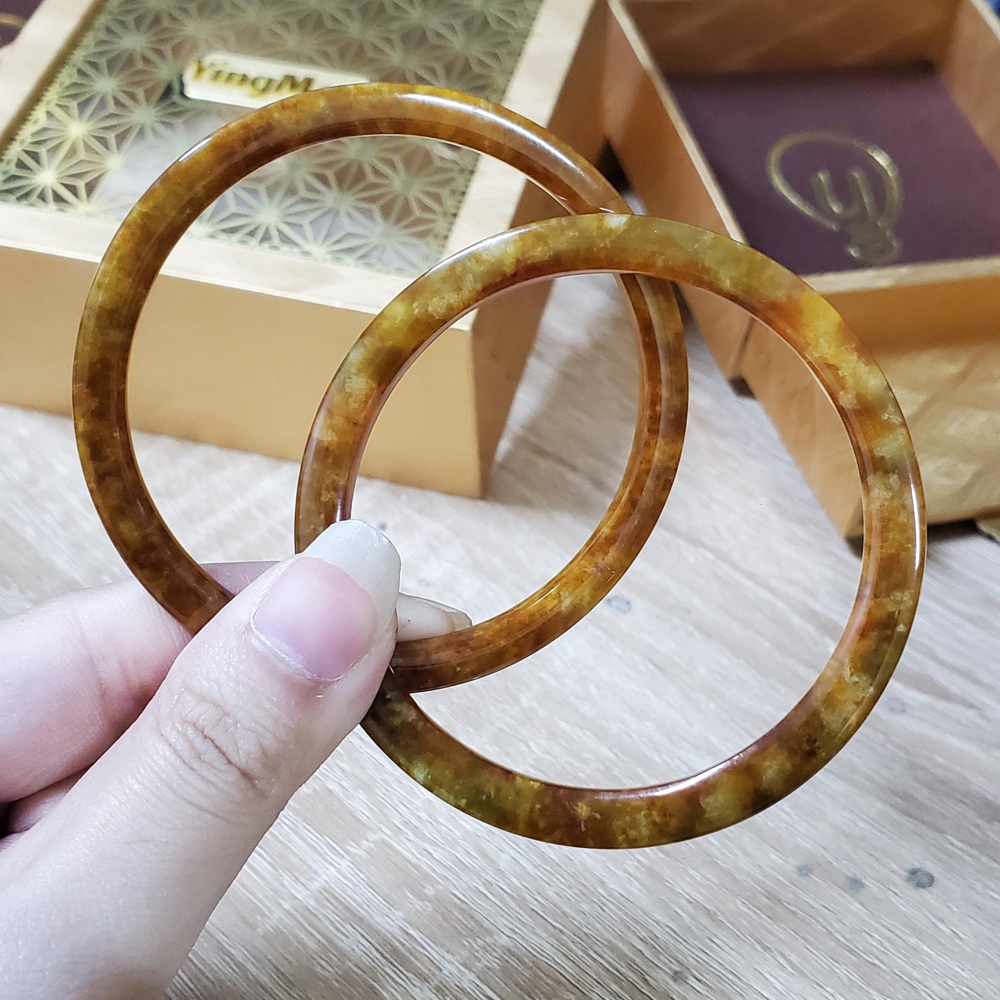 π Timeless Vintage Elegance: High Quality Yellow mixed Green/Black/Brown Spot jade bangle symbolising wealth, health & prosperity.