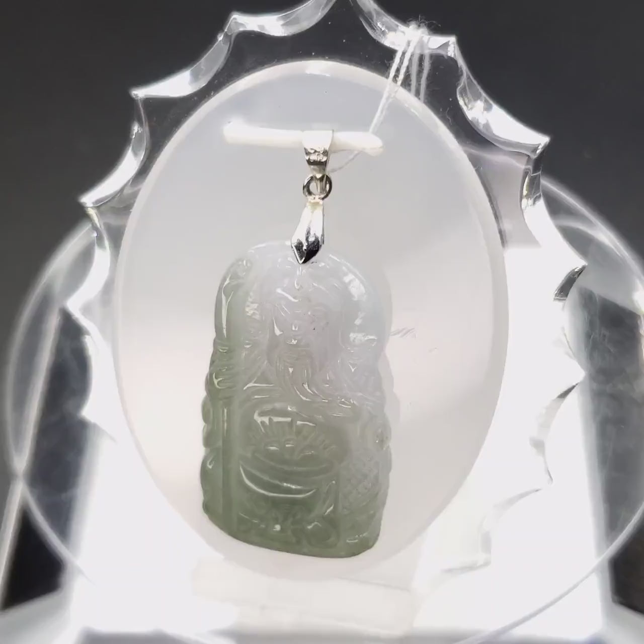 Yingmart Guan-Gong White Green Burmese Myanmar Genuine Jadeite Jade Grade A Hand Craving Pedant with Hook setting